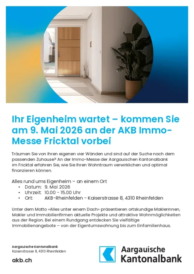 Ihr Eigenheim wartet! Besuchen Sie uns am 09.05.2026 von 10:00 - 15:00 Uhr im Regionalsitz der AKB in Rheinfelden. Unter dem Motto "Alles unter einem Dach" präsentieren ortskundige Maklerinnen, Makler und Immobilienfirmen aktuelle Projekte und attraktive Wohnmöglichkeiten aus der Region. Zudem stehen Ihnen unsere Kundenberaterinnen und Kundenberater bei Fragen zur Finanzierung zur Verfügung.